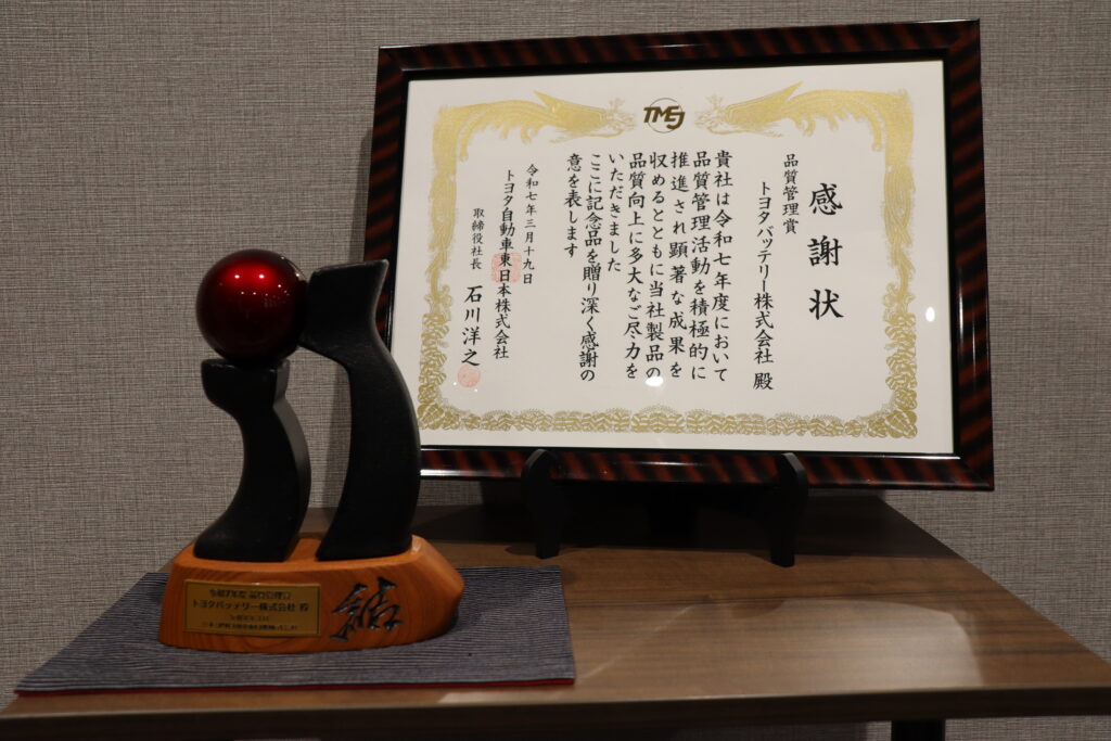 トヨタバッテリー株式会社は、トヨタ自動車東日本株式会社より「品質管理賞」を受賞しました。本賞は、品質管理活動を積極的に推進し、顕著な成果を上げたサプライヤーに贈られるもので、「納入不具合ゼロの継続」と「継続的な品質改善活動」が評価され、2年連続の受賞となりました。